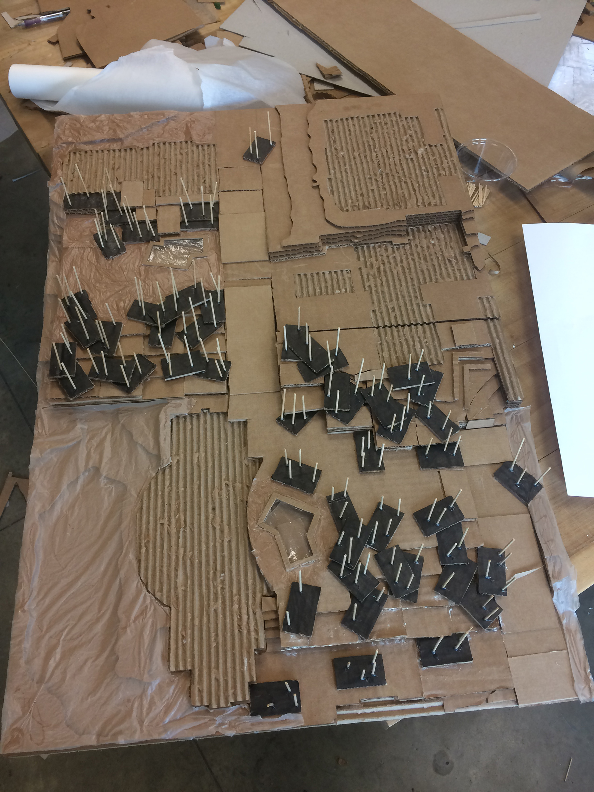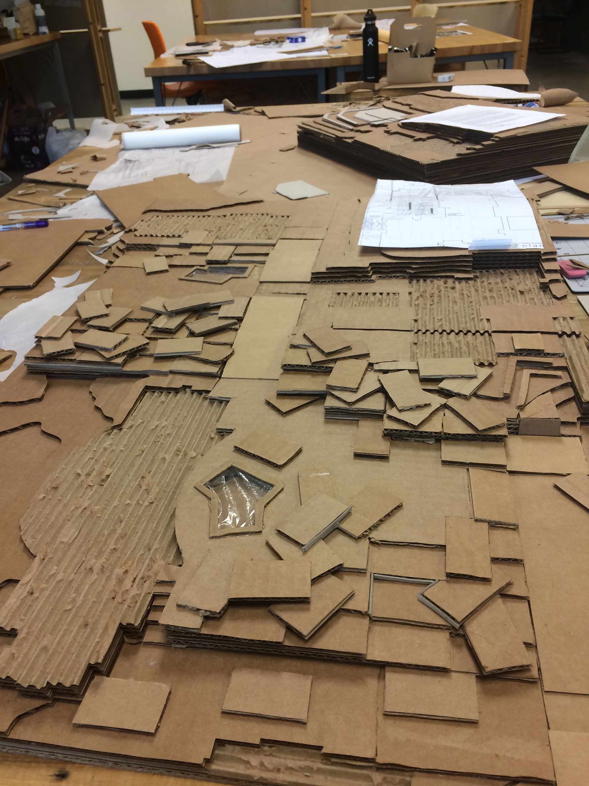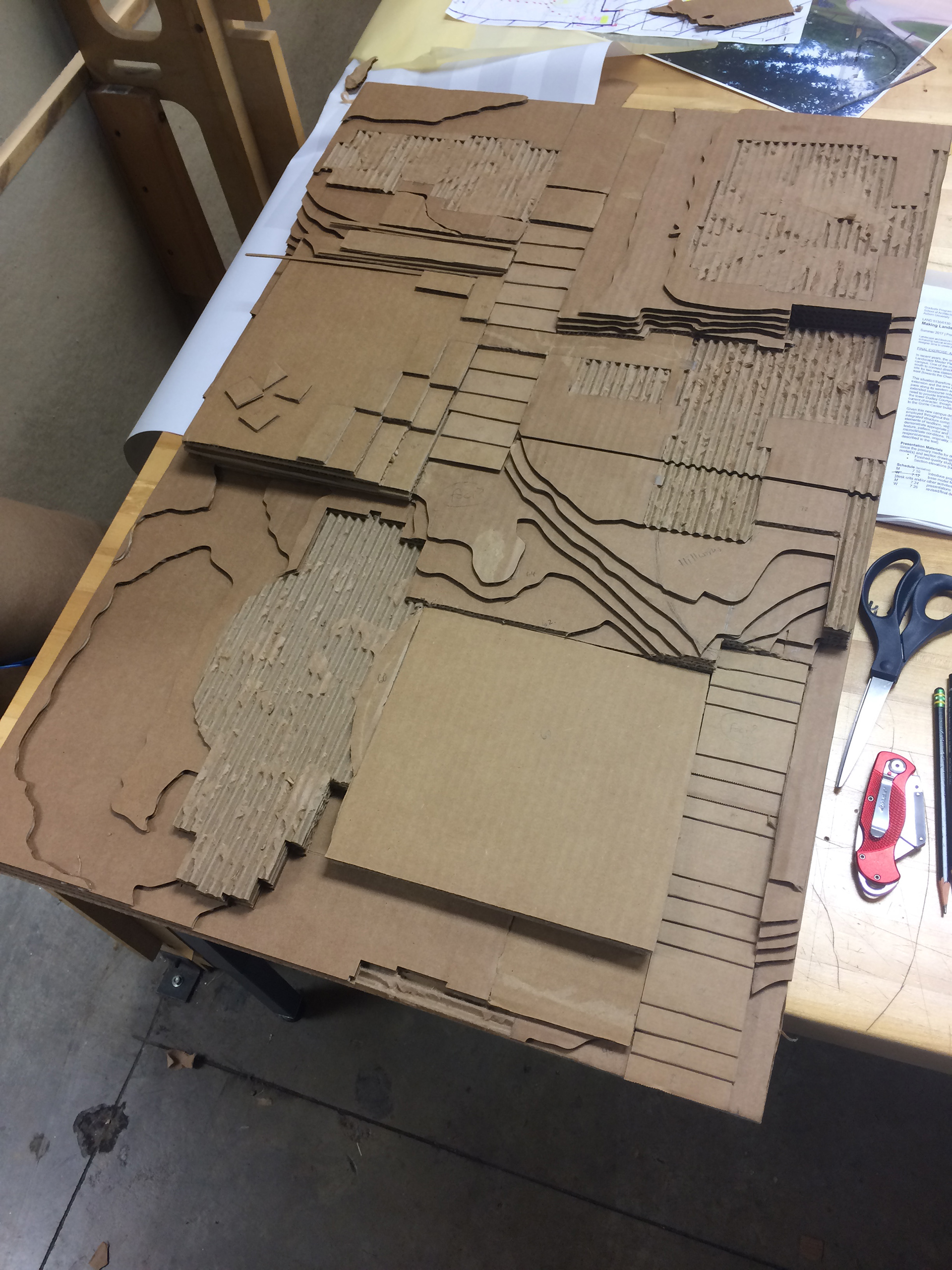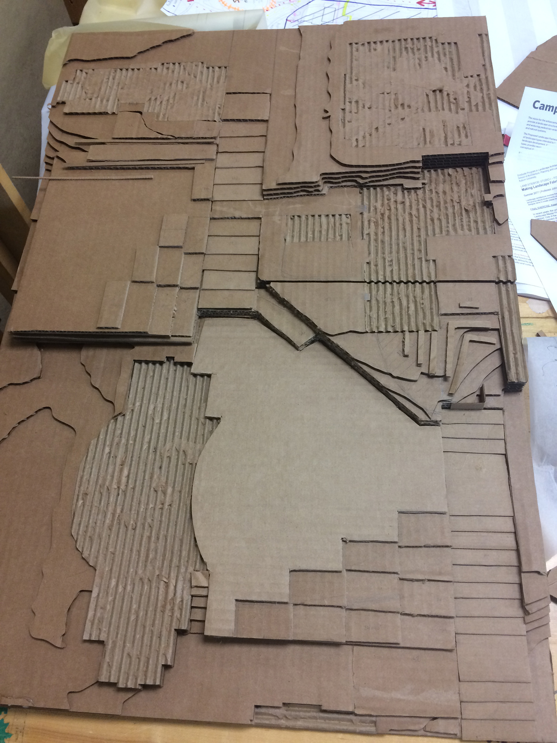 For this project, our class was assigned to redesign the concourse on Auburn University Campus near our classroom. We used a map from Auburn University Facilities Management to plot a base model on the laser cutter. For my design, I knew that I wanted to maximize usable space and accessible paths, so I created level lawns and wide gentle ramps. I designed a heavily treed, terraced grid on the edge. I then used the rectangular shape to create more interesting and comfortable spaces for students. After review, I varied the shapes of the rectangles and aligned the trees to a grid, to emphasize the existing contrast.